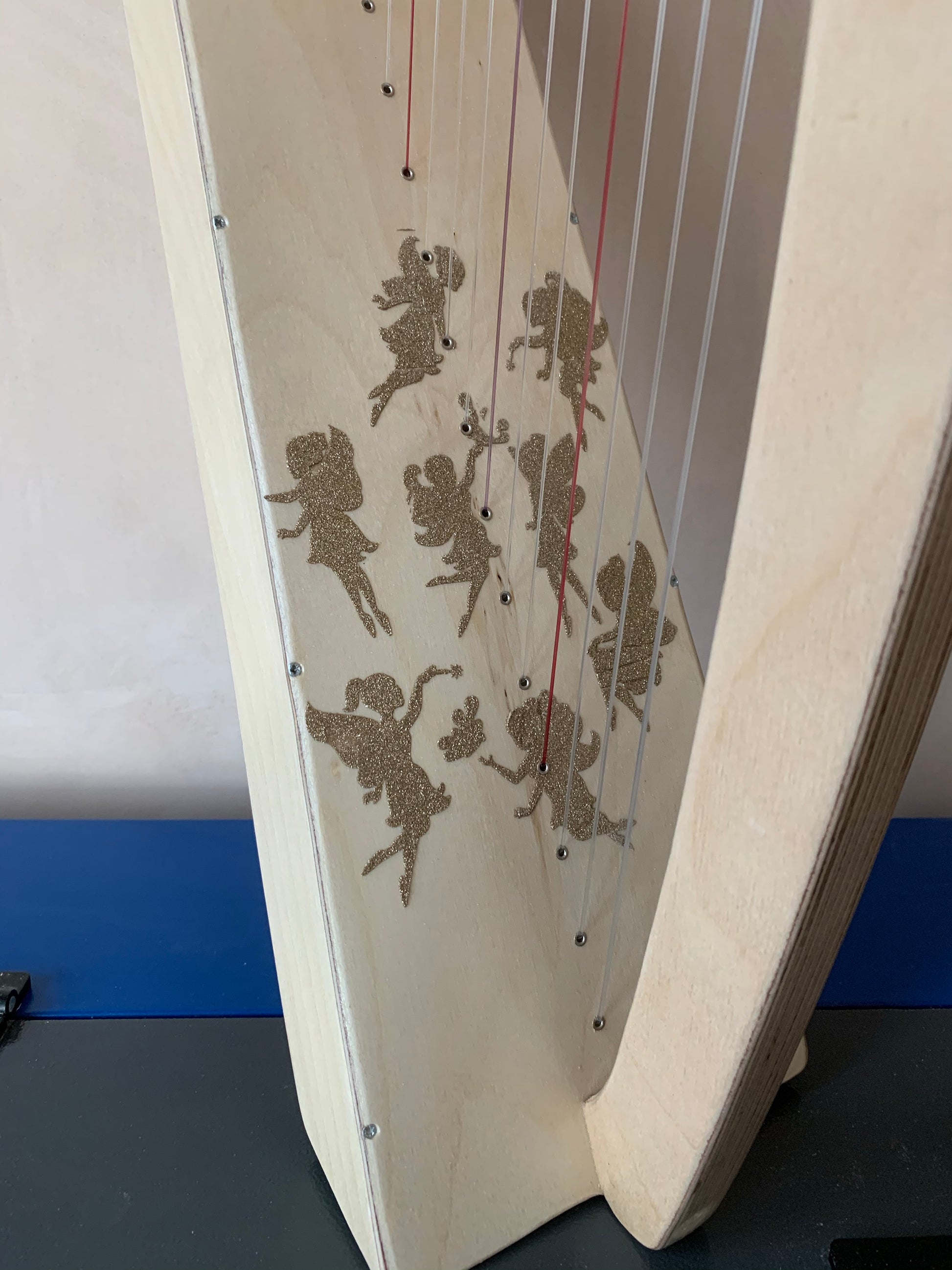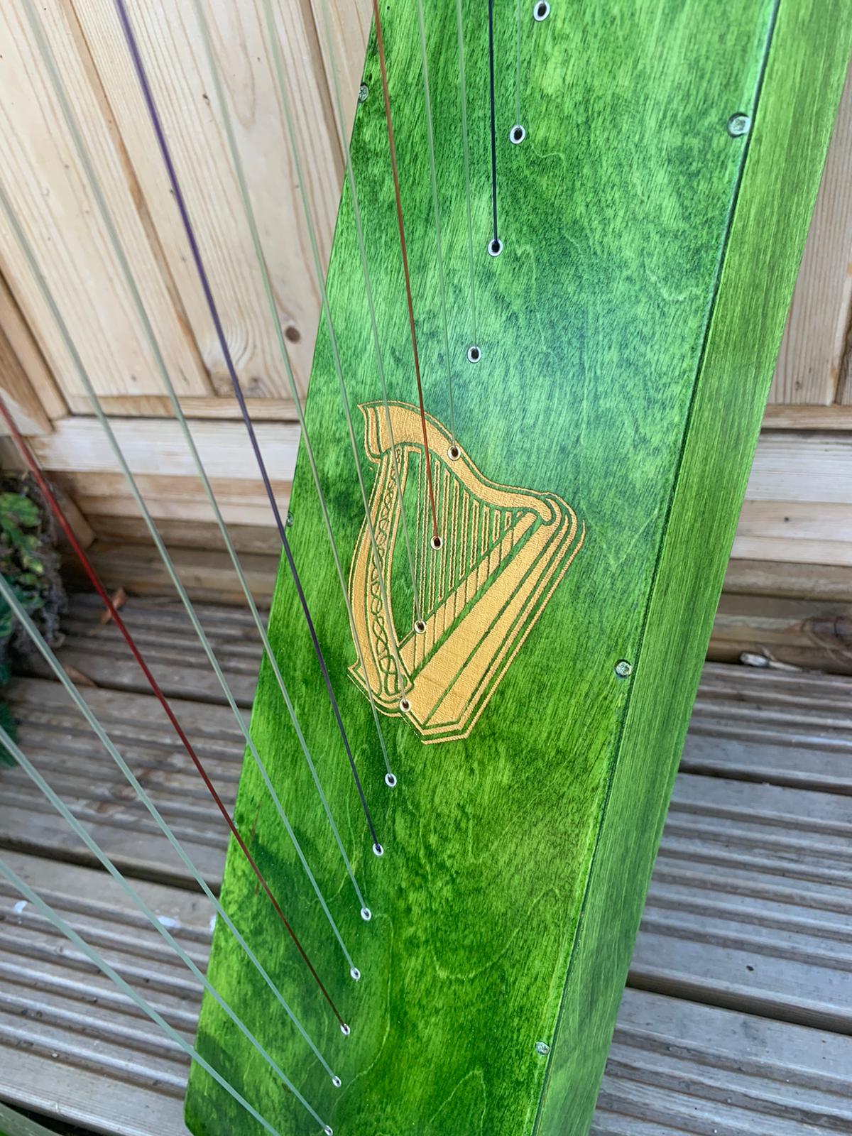 All of our harps are hand built to order due to the large range of colour choices and soundboard designs available - please allow at least 4 weeks for delivery.