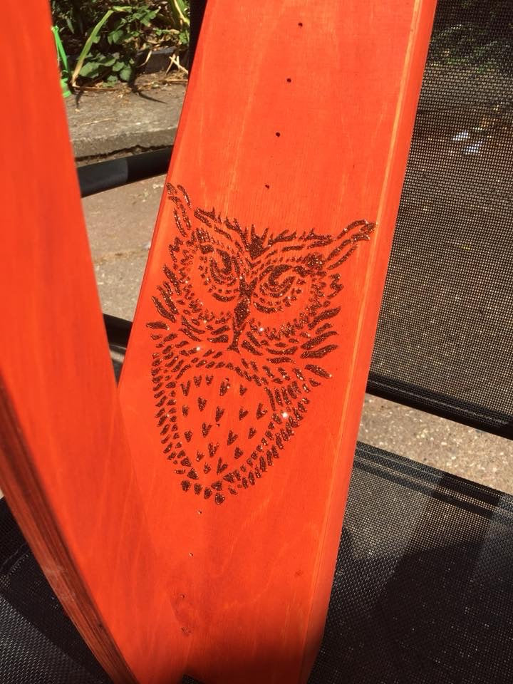 This harp comes in purple, blue, orange, red and green wood stains - your choice, see the drop down panel on the left for available colours and soundboard embellishments which include Welsh Dragons, Unicorns, Mermaids, Stars and Daffodils, Bats, Dragonflies, sloths, paws, fairies and Butterflies if you would like a different combination to those shown please message us as most things are possible!